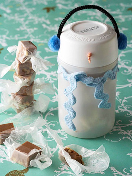 Using some common crafting materials, like pom poms and rick rack, you can transform your plastic container into a cute little snowman in just minutes. Just fill the container with your favorite treats and you’re set to go! These could also make great party favor containers if you’re entertaining over the holidays.