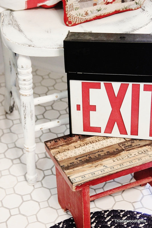 All it took was a cute, chippy red footstool she already had and some of those yardsticks to make a bench with tons of character. I adore that yardstick topped seat-I can think of so many fun places to use this! It’s perfect for back to school decor, Christmas, Valentine’s Day….too cute!