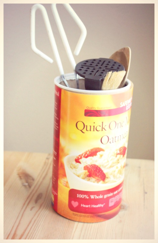 Sure enough, Eliza turned that oatmeal box into a handy countertop holder for some of the cooking utensils she uses most often. It’s hard to tell this used to be a humble oatmeal box-this container looks pretty enough to have come from a fancy kitchen store!