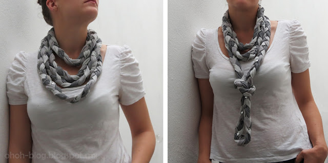 At the OhOh Blog, Ama says that she saw a girl on the street wearing a braided scarf and decided she wanted one, too! She went home and found a few old t-shirts and turned them into a scarf of her own.