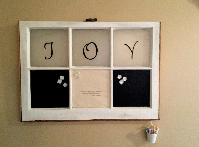 Since then, Patty has been using those windows to make all kinds of things-including gifts for friends and family-like this message center. The addition of magnetic chalkboard paint and a small bulletin board to three of the panes turned one old window into a perfectly sized message center. I especially like the letters that spell out “Joy” in the upper panes.