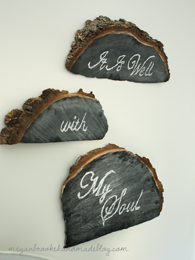 At home, Megan used chalkboard spray paint to turn these pieces of wood into a neat wayto decorate a wall. The organic shapes combined with the lettering on the chalkboard surfaces makes this arrangement visually very interesting.